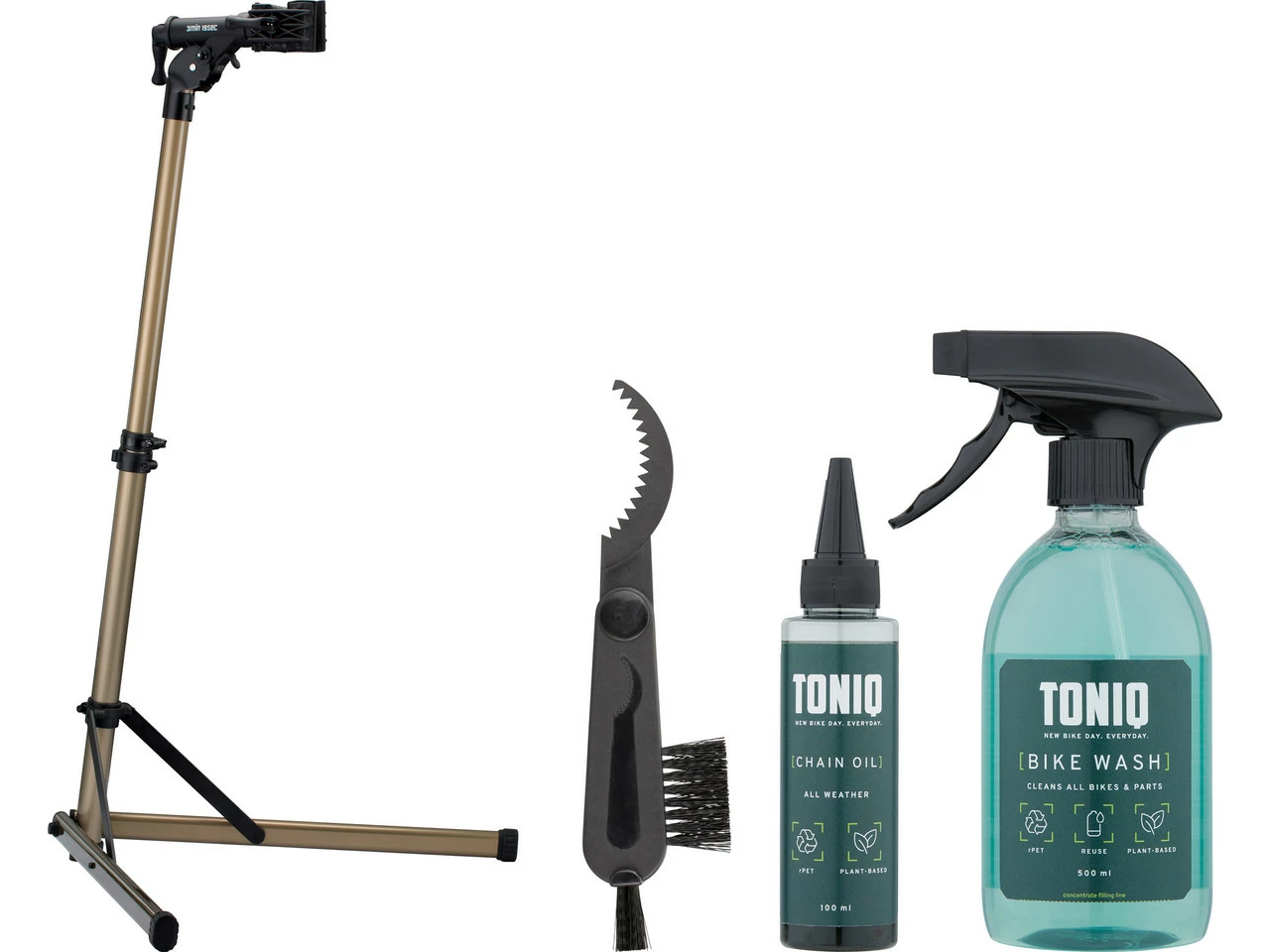1 x Soporte de montaje de 3min19sec1 x Limpiador de bicicletas TONIQ Bike Wash 500 ml1 x Cepillo de limpieza 3min19sec1 x Aceite para cadenas TONIQ Chain Oil 100 ml