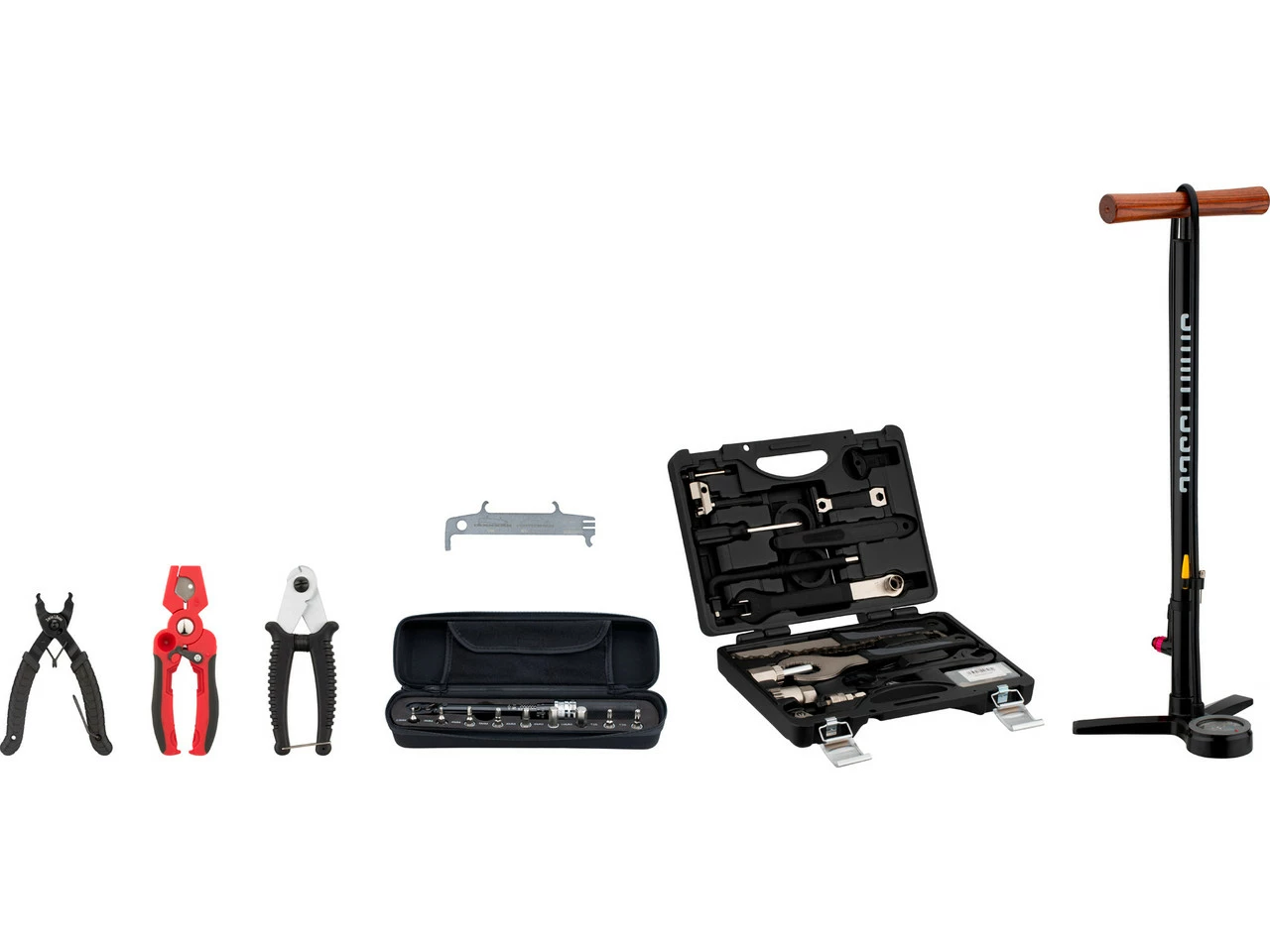 1 x Maletín de herramientas de bicicletas BTK-2 con contenido1 x Llave dinamométrica Premium con juego de puntas y estuche1 x Alicates de cierre de eslabones de cadena1 x Medidor de desgaste de cadena 2.01 x Cortador de cables Bowden1 x Cortador de líneas de frenos1 x Bomba de pie de aluminio