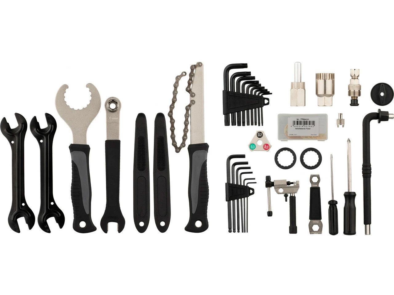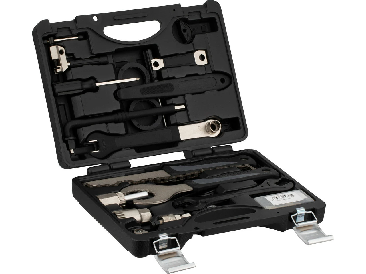 Cadena / cassette: tronchacadenas, latiguillo de cadena, extractor de cassette para cierre rápido y eje pasante, también adecuado para discos de frenos Center-Lock con bujes de cierre rápidoBiela / eje de pedalier: llave para tornillos de bielas Hollowtech II, extractor de ejes de pedalier, llave de caja de pedalier, también adecuada para discos de freno Center-Lock con bujes de eje pasante, adaptador Shimano SM-BBR60, adaptador Shimano SM-BB9000 BB93, extractor de bielas, llave de tornillos de platosCubierta / rueda: desmontadores de cubiertas (par), kit de parches, llave de válvulas AV y SV, llave de radios para cabecillas de 3,2 mm (0.127”), llave de radios para cabecillas de 3,3 mm (0.130”), llave de radios para cabecillas de 3,4 mm (0.136”)Pedal / buje: llave de pedales, llave de cono 13 mm, llave de cono 14 mm, llave de cono 15 mm, llave de cono 16 mmHerramientas de atornillado: destornillador con hoja intercambiable: plano 5 mm / destornillador Phillips 3 mm, hexagonal 2 mm / 2,5 mm / 3 mm / 4 mm / 5 mm / 6 mm / 8 mm, Torx T10 / T15 / T20 / T25 / T30 / T40 / T45 / T50Más información acerca del maletín de herramientas