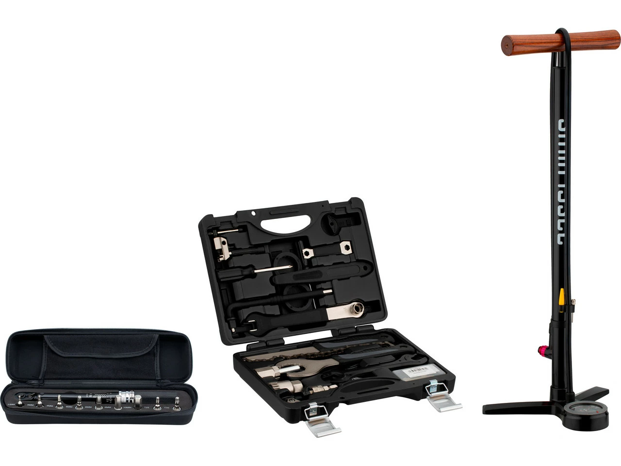 1 x Maletín de herramientas de bicicletas BTK-2 con contenido1 x Llave dinamométrica Premium con juego de puntas y estuche1 x Bomba de pie de aluminio