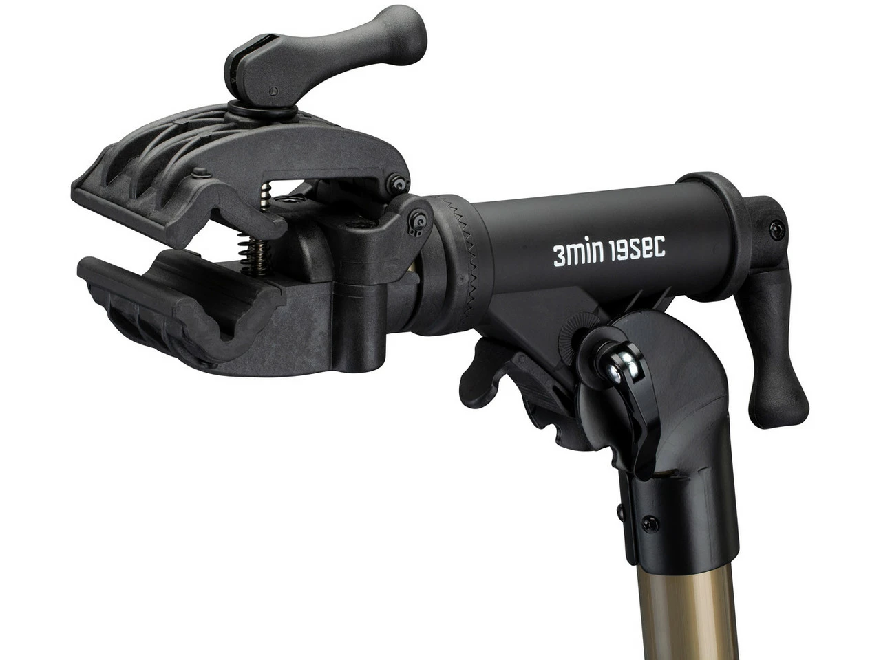 El soporte de montaje de 3min19sec parece bastante sencillo, convence sin embargo con sus características prácticas y su robusta elaboración. Gracias a la garra de manejo intuitivo, puedes colgar la bici en un abrir y cerrar de ojos. Gracias al fino mecanismo de trinquete, la pinza puede girar continuamente en 360°. Las mordazas de la garra protegen la bicicleta y/o el cuadro para que no se produzcan arañazos. Debido a su robusta construcción, se pueden colgar bicicletas de hasta 25 kg. El portabicicletas del taller se puede plegar en un abrir y cerrar de ojos para facilitar el transporte o el almacenamiento.