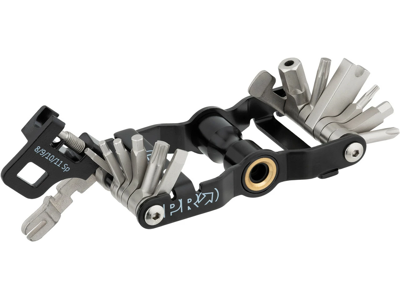La minitool PRO Team CO2 de PRO incluye 20 funciones y no contiene ninguna herramienta suelta que pueda perderse en una gira. Entre las 20 funciones incluidas en la herramienta están un inflador CO2 y una herramienta integrada para el conector Shimano Di2.