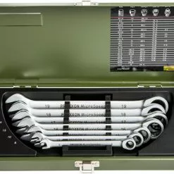 Características:donde las llaves convencionales ya no pueden ser implementadas, la función de trinquete demuestra su valordiseño de engranaje encapsuladodimensiones externas extremadamente pequeñas para anchos de llavescabeza muy delgadaanillo interior de 72 dientes de acero especial de alta aleaciónel accionamiento se produce ya con un movimiento de palanca de 5°los pares transmisibles están muy por encima de la norma DIN/ISOejes de acero CrV con protección superficial óptima (2 x niquelados, 1 x cromados mate)ancho claramente legible en las llaves gracias al proceso de marcado por láserpara ahorrar tiempo al trabajar sin tener que cambiar de posiciónideal para «perforar» en espacios estrechosen versión extra largacaja robusta de acero con recubrimiento de polvo7 piezasAsesoría de tallas:8 mm: