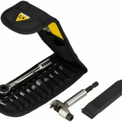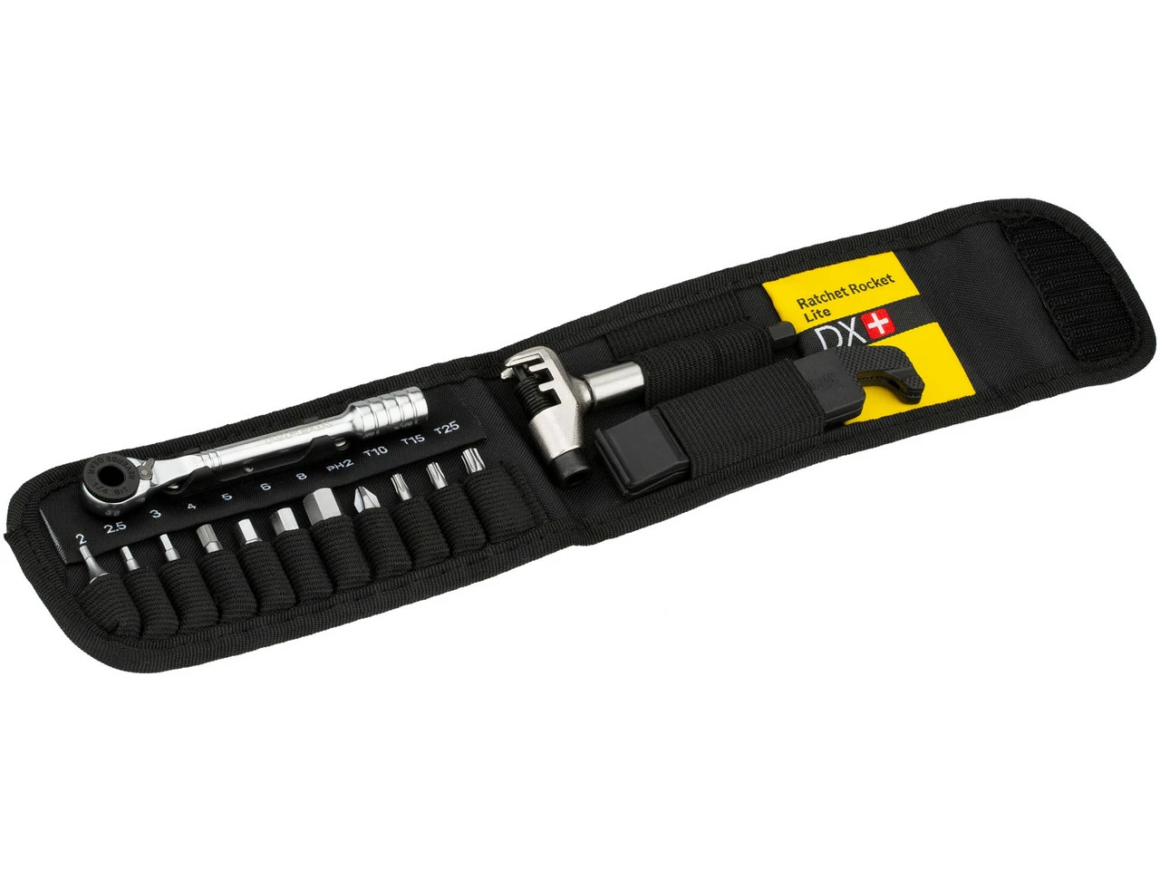 El compacto set de herramientas Topeak Ratchet Rocket Lite DX+ viene con una carraca reversible de dientes finos con palanca de precisión para cambios rápidos de dirección, puntas de acero endurecido, dos desmontadores de cubiertas, tronchacadenas y un portapuntas magnético.