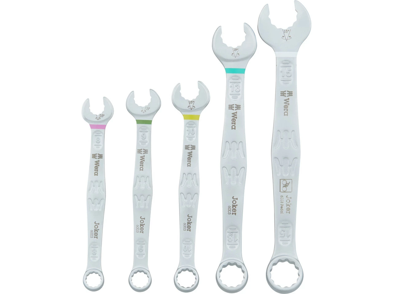 4 x Llave de boca y anillo Wera Joker 6003 (8, 9, 10, 13)1 x Llave de boca y anillo Wera Joker 6003 Pedal (15)1 x Tira velcro Wera1 x Estuche plegable Wera