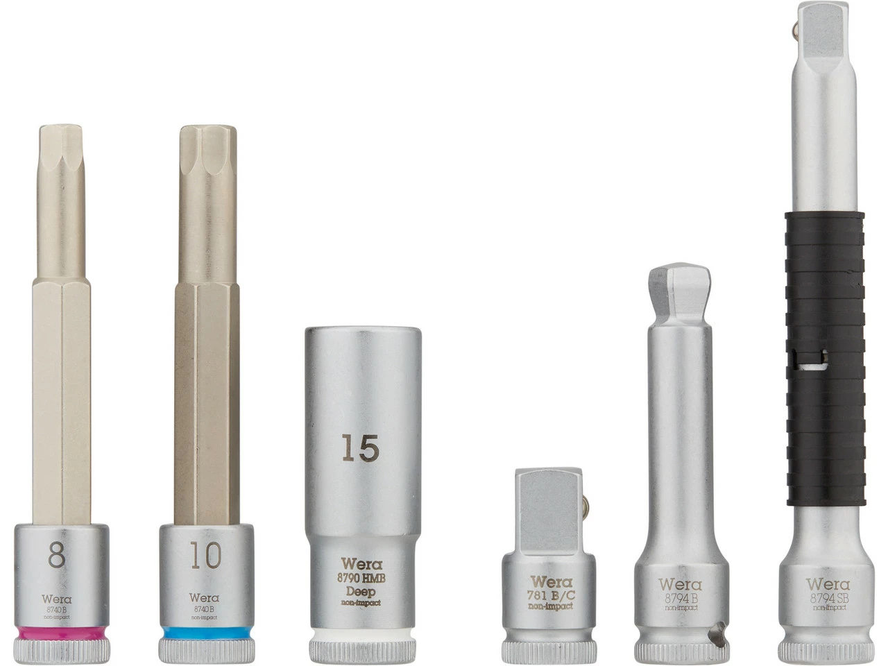 1 x Carraca Wera Zyklop Speed10 x Vaso Wera Zyklop2 x Vaso de punta Wera Zyklop10 x Bit Wera1 x Extensión Wera Zyklop Wobble1 x Extensión Wera Zyklop con manguito de giro rápido1 x Adaptador de bits Wera1 x Adaptador Wera cuadrado exterior 3/8″ a cuadrado exterior 1/2″1 x Bolsa de transporte Wera1 x Tira velcro Wera