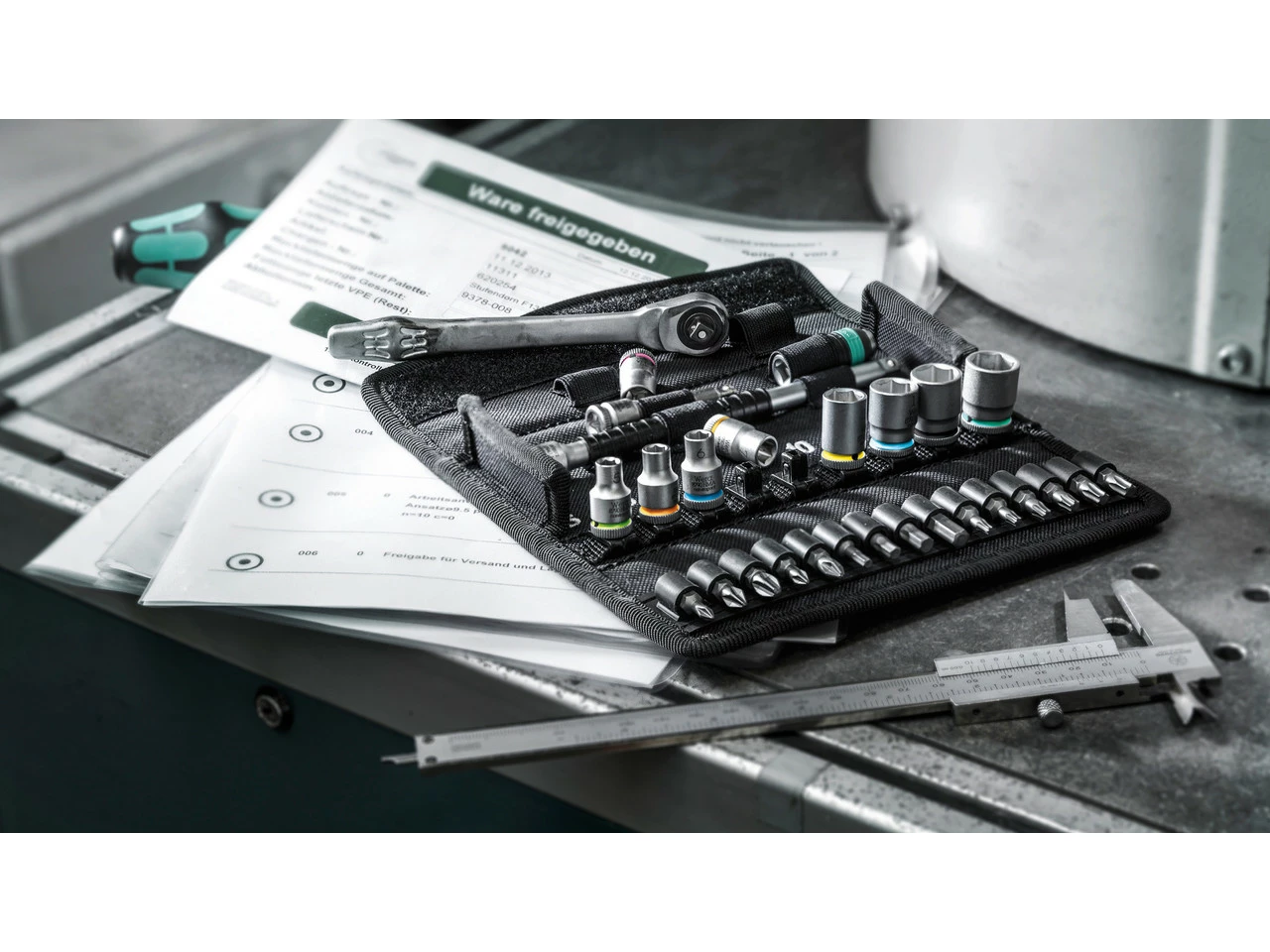 Wera ha inventado una sensación de sets completamente nueva. Hasta ahora, las carracas y los accesorios solían venir empacados en cajas metálicas robustas pero toscas y a veces pesadas. La caja textil compacta supone un alivio insospechado en cuanto a movilidad y necesidad de espacio. La misma cantidad de herramientas que se tenía que sujetar antes por el mango con al menos una mano, ahora viene en una caja compacta, que a su vez puede formar parte de un estuche de herramientas en el que se pueden transportar muchas otras herramientas. Ya no es necesario ir y venir varias veces para llevar herramientas de un lugar a otro. Y el peso significativamente reducido del set hace que sea mucho más cómodo de llevar que antes. Las superficies sensibles quedan bien protegidas al guardarse. La caja también es increíblemente robusta. La caja textil y las herramientas incluso resisten caídas sin daños.