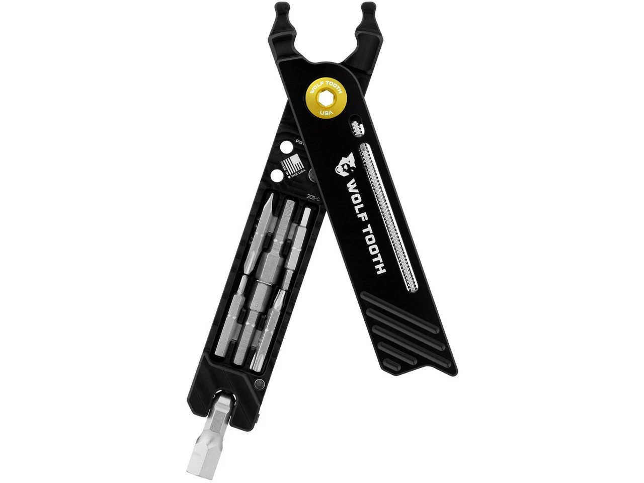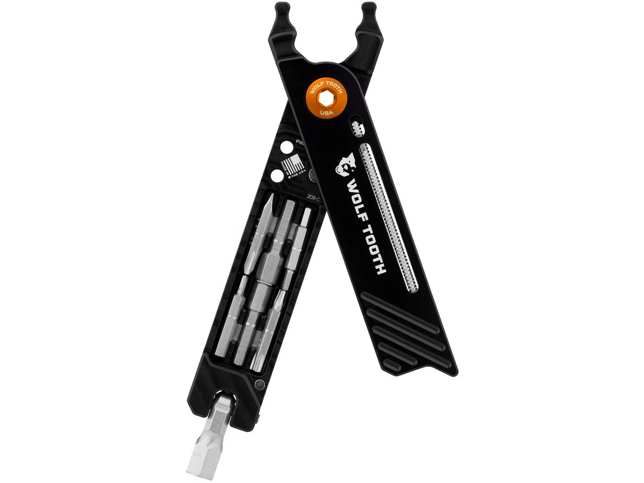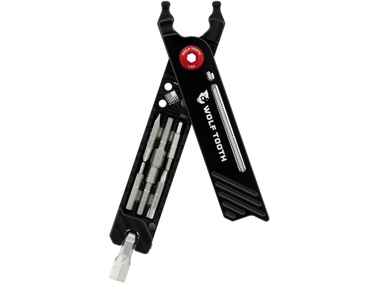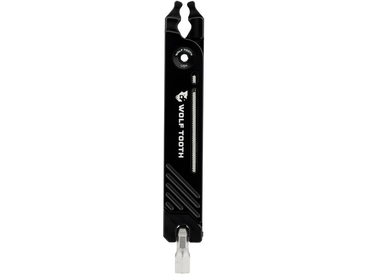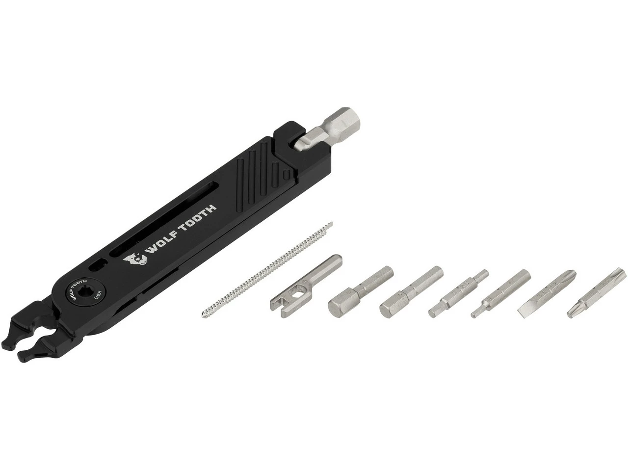 Los alicates combinados Wolf Tooth Components 8-Bit Pack Pliers vienen con una herramienta multiusos integrada brilla con 17 funciones que puedes usar para pequeñas reparaciones en el camino. El mango de los alicates esconde las puntas que se pueden fijar en la cabeza giratoria en la parte inferior para su uso. También hay espacio para dos mitades de cierres de cadena (no están incluidos en el volumen de envío). Todo está fijado magnéticamente, hasta las pinzas se cierran con imanes. También puedes usar los alicates para quitar los núcleos de las válvulas, apretar las tuercas de válvulas y abrir los eslabones del cierre de cadena.