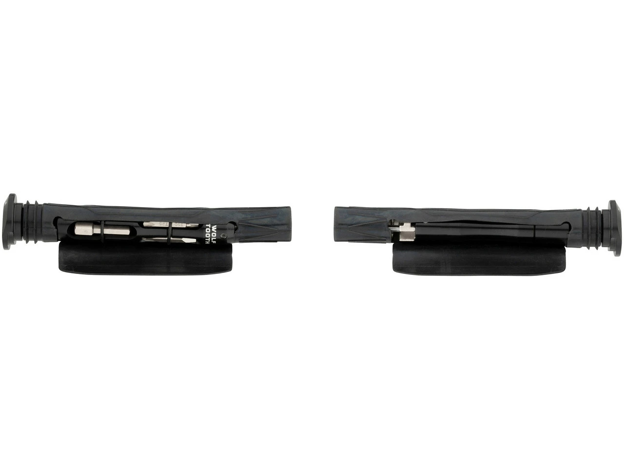 El set de herramientas Wolf Tooth Components EnCase System Bar Kit One es el sistema completo EnCase de Wolf Tooth. Incluye una herramienta multiusos con 14 funciones, una herramienta combinada y dos contenedores alargados en los que puedes guardar las herramientas en el manillar. La herramienta multiusos incluye ocho puntas para llaves de vaso hexagonales, Torx, de estrella y planas, así como una llave de radios y una herramienta para válvulas. La herramienta combinada EnCase System Chain + Tire Plug combina un tronchacadenas para cadenas de hasta 12 velocidades y una herramienta Tubeless con cinco parches. Ambas herramientas se pueden transportar en el manillar con la ayuda de los contenedores Storage-Sleeves. Estos están hechos de goma que amortigua las vibraciones y tienen tapas de aluminio que sustituyen a los tapones de extremos de manillar convencionales. También se incluye un Fit Kit específico para Dropbars de mayor diámetro.
